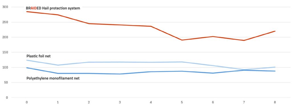Unlike most competing systems made from polypropylene foil or plastic nets, the BRAIDED Hail Protection System is produced from high-tenacity polyester. Tensile strength tests by an independent laboratory confirm that this combination results in exceptional durability. - Faster installation and easy removal: